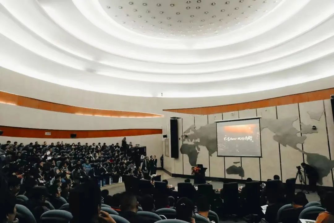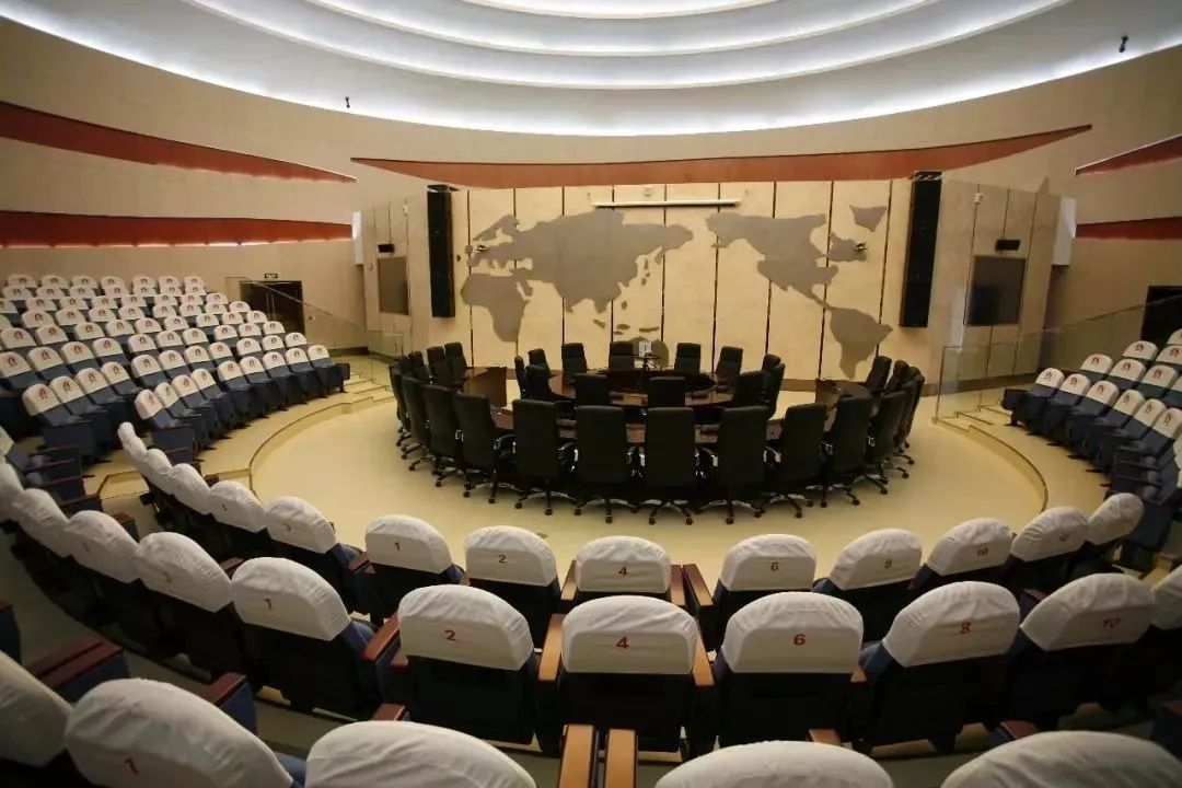 国际报告厅总面积530平方米,厅内剧院式座椅388个,环形主席台内外两排33座,共可容纳421人。